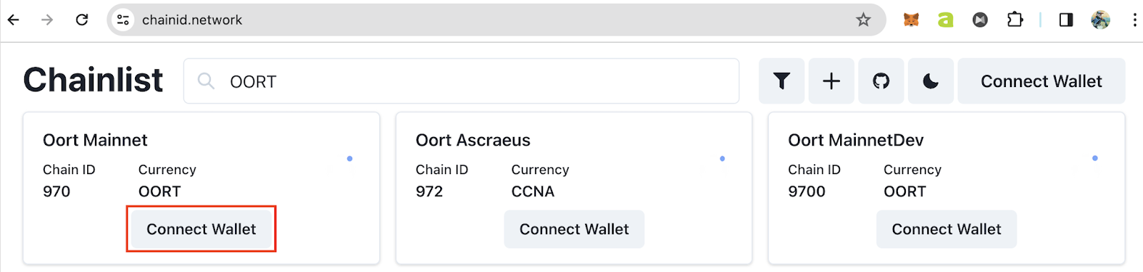 Next, visit chainid.network and type OORT in the search box, all the networks related to OORT will appear. Click “Connect Wallet” in the Oort Mainnet tab.