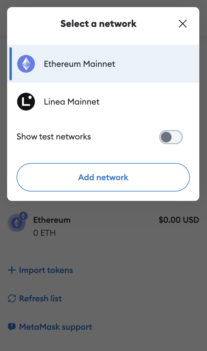 The dropdown menu will show all the networks that Metamask has connected to. By default, there are two networks - “Ethereum Mainnet” and “Linea Mainnet”