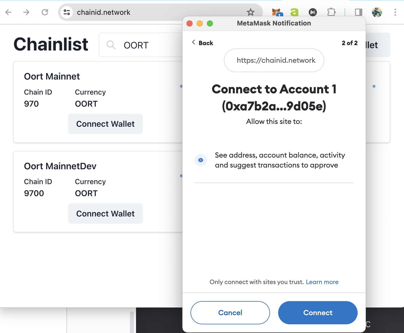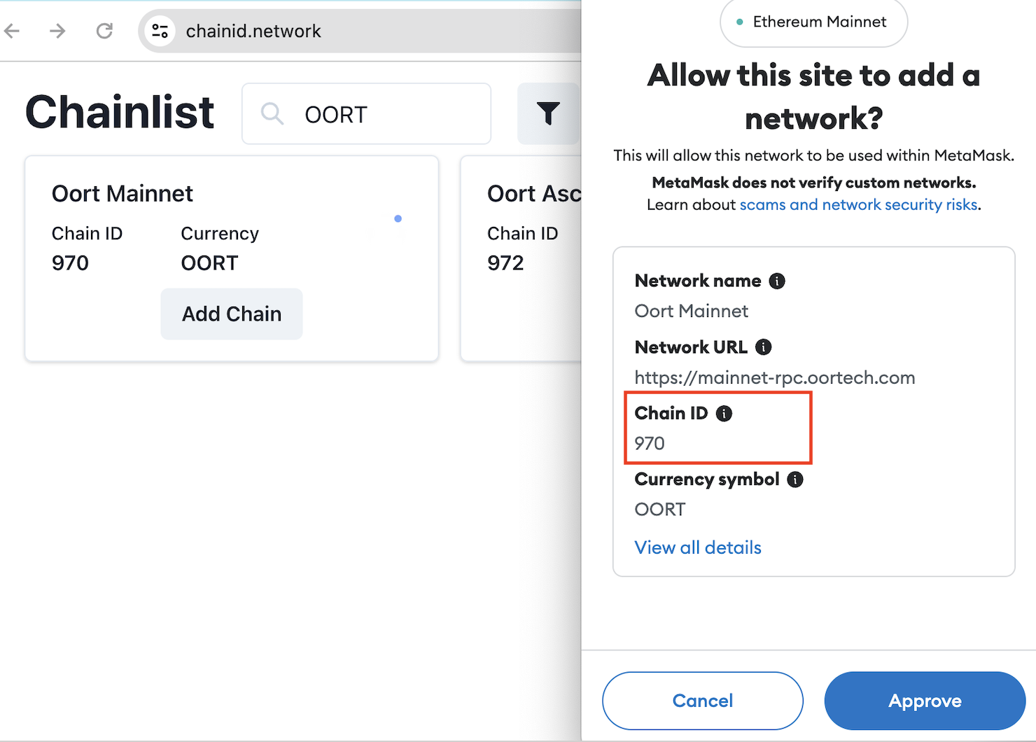 Click “Add Chain”, Metamask will ask your approval to add OORT Mainnet to it. As you can see, the ChainID of OORT Mainnet is 970.